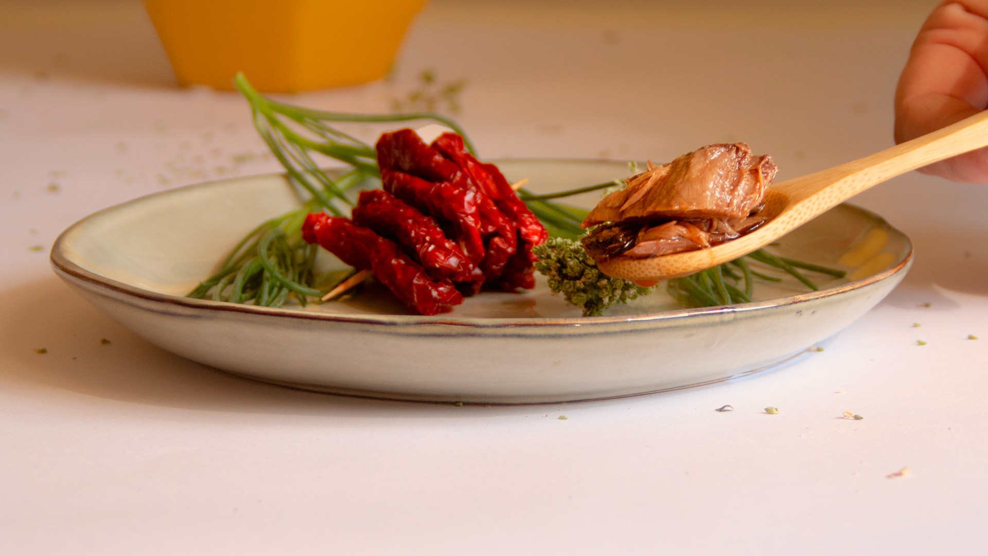 Trita finemente l’aglio e soffriggilo in EVO a fuoco moderato. Poco prima che l’aglio si dori, aggiungi pomodorini e capperi, girando di tanto in tanto. A metà cottura aggiungi il Tonnetto COLIMENA e spegni momentaneamente (gli ingredienti non devono friggere ma appassire lentamente). Porta a cottura le linguine, scolale e versale nella pentola con la base di tonno. Riaccendi la fiamma e cuoci con un pizzico di peperoncino e prezzemolo.